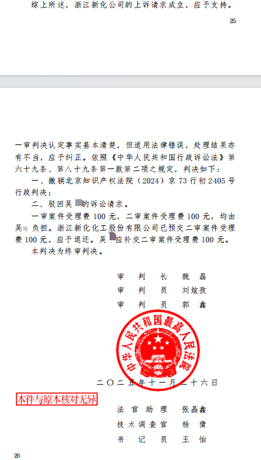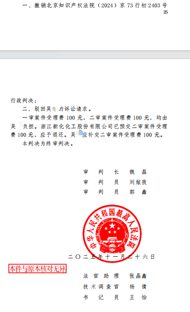 近日,最高人民法院就两起涉及浙江新化化工股份有限公司(简称“新化股份”)(2024)最高法知行终1283号、1284号作出终审判决,撤销北京知识产权法院(2024)京 73 行初 2403、2405 号行政判决,驳回吴某的诉讼请求,明确维持新化股份核心技术专利的合法有效性。这场历时两年多的确权之战,彰显了公司坚守创新成果、捍卫知识产权的坚定决心。